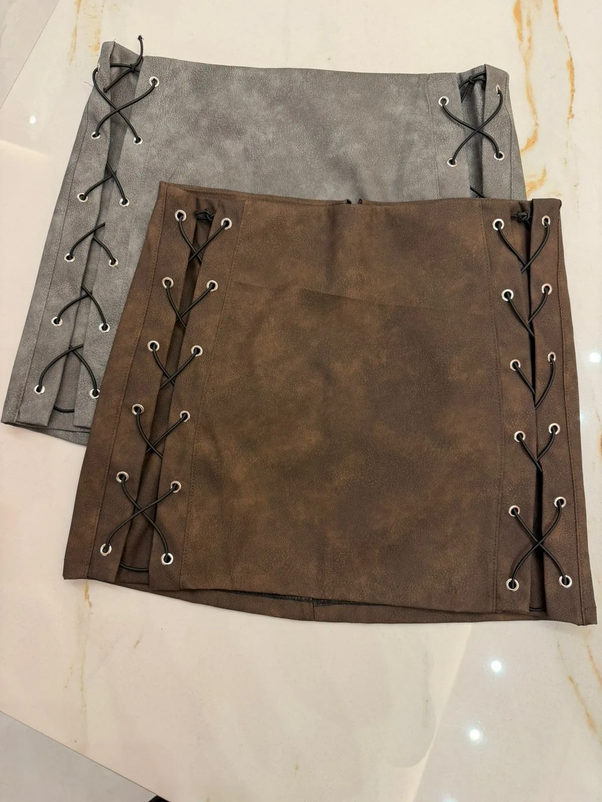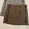 pollera eco cuero ojales cruzados laterales, cierre atrás