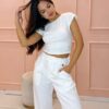Detalle: Pantalón de tela sastrera con pinzas delanteras, elástico trasero y bolsillos laterales