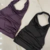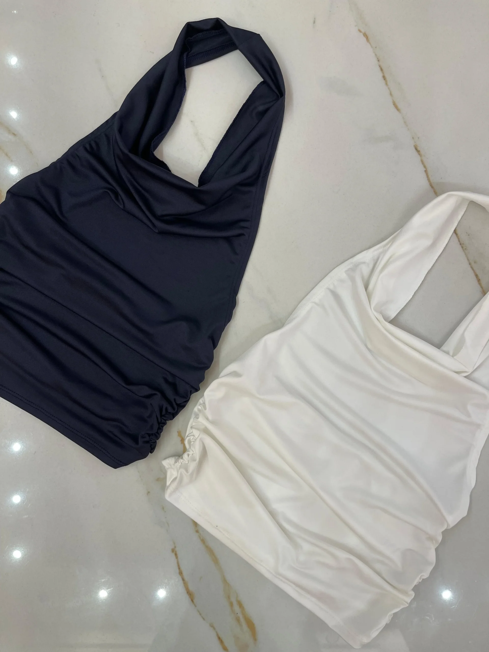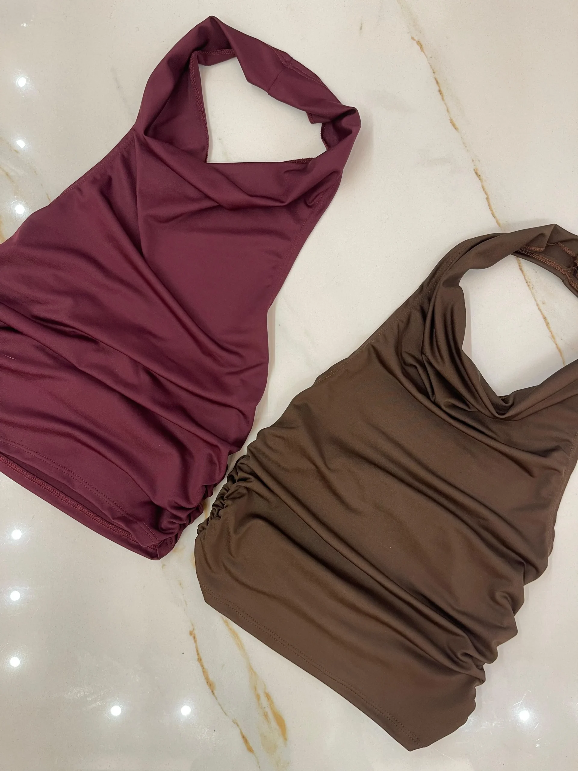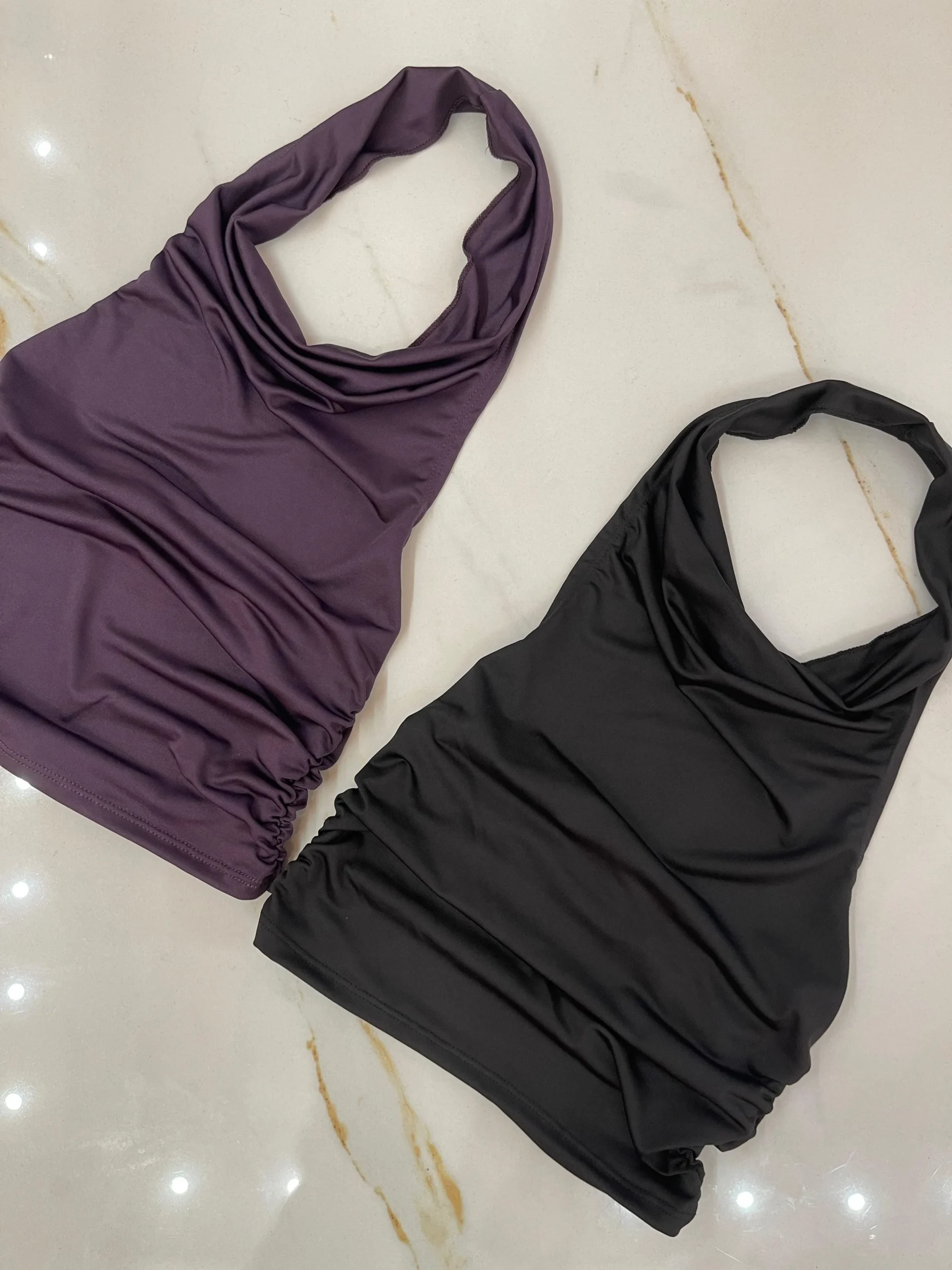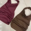 Top de microfibra con cuello Marilyn, escote buche, espalda descubierta y frunces a los costados.