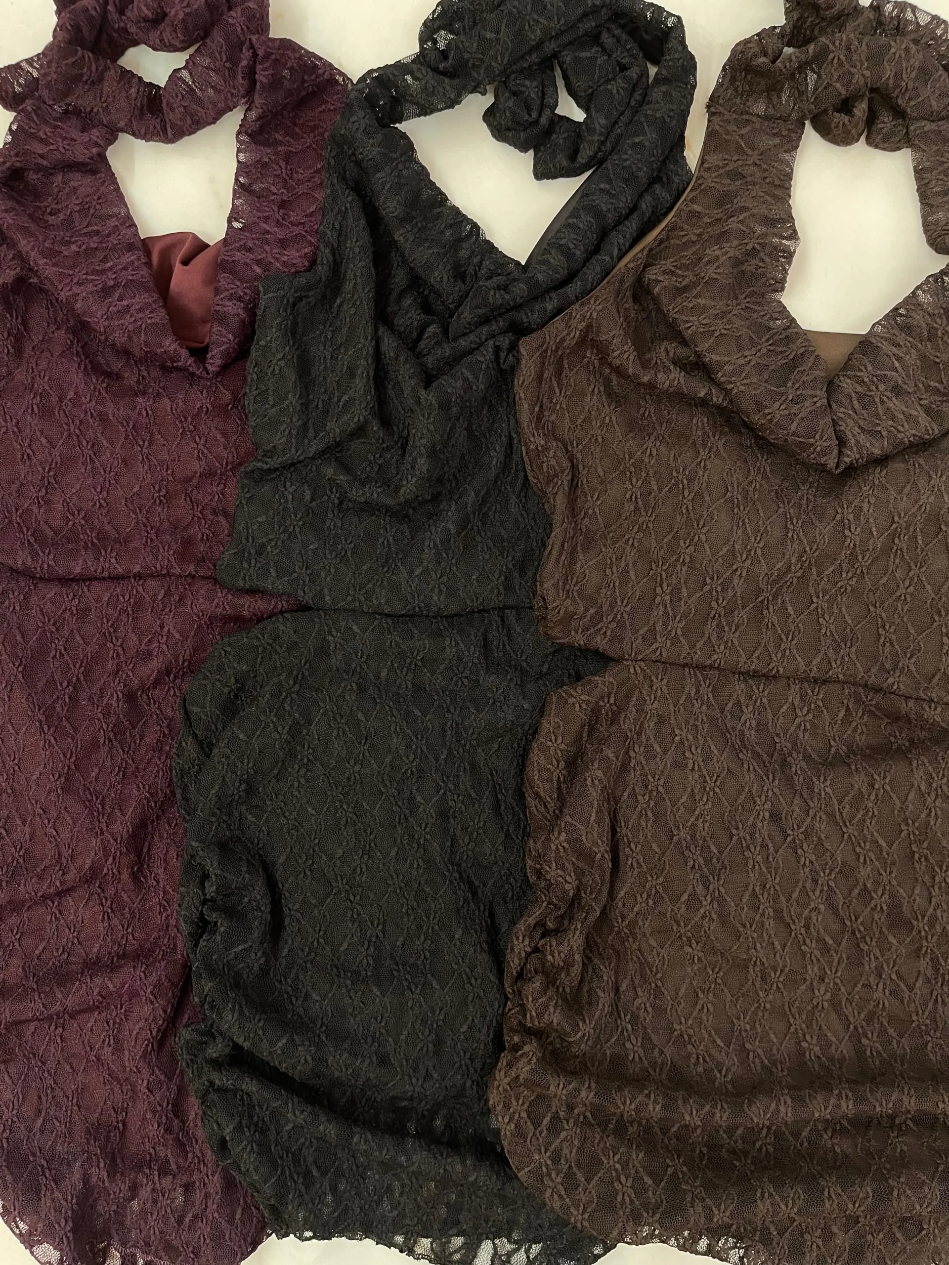 Vestido de encaje elastizado con forrería, escote buche, cuello para atar, abertura en cintura trasera y frunces en la caderas