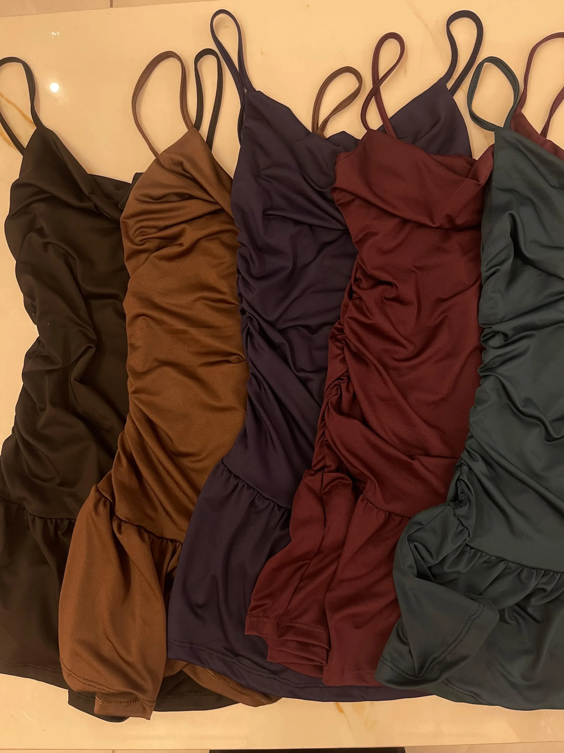 Vestido de microfibra con escote buche, tiritas, frunces laterales y pollera acampanada